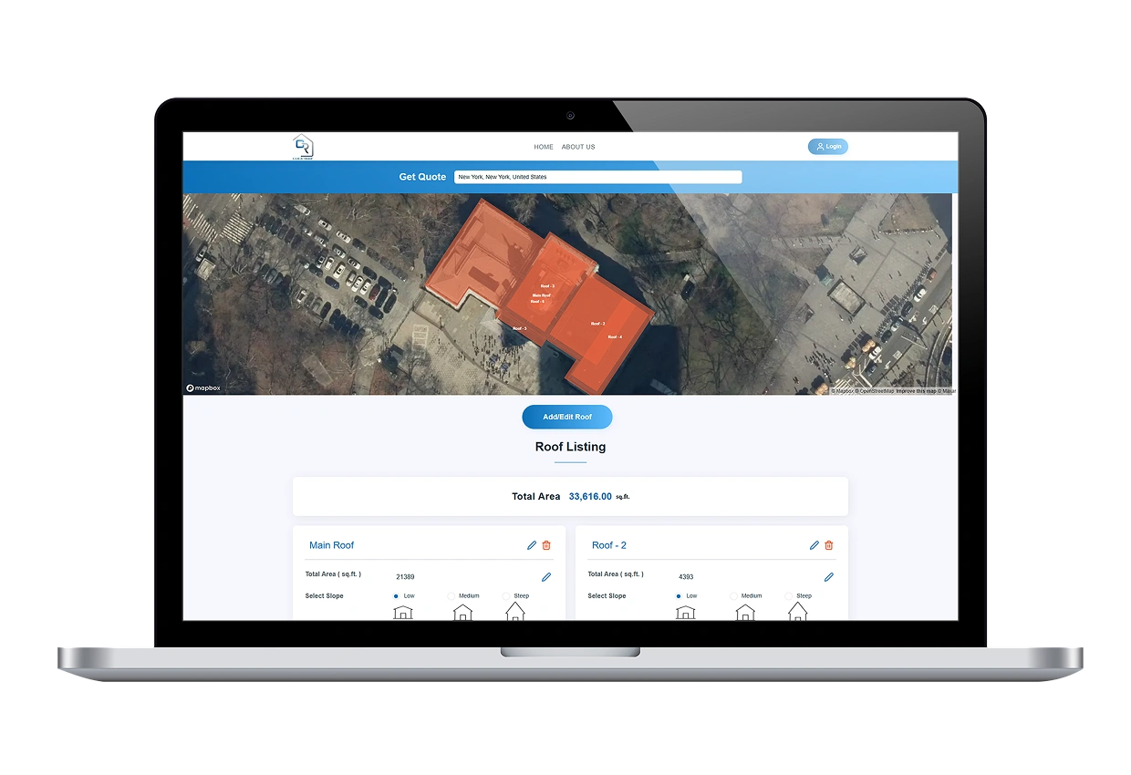 Our team built a web platform centred around Mapbox for the mapping piece. Users type their address, the system finds their roof, and they’re looking at it on screen within seconds. We designed a quote engine that recalculates prices on the fly as people change tile types, colors, or deal with complex roof shapes. All the pricing logic pulls from admin-configured rates, so there’s central control over what vendors charge.